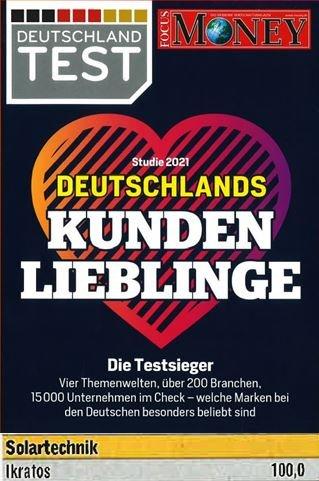 Focus Money Deutschland Test Kundenlieblinge 2021 kürt iKratos zu Deutschlands Kundenliebling im Bereich Solartechnik 2021. Bereits 2020 erhielt das oberfränkische Familienunternehmen diese Auszeichnung. Hintergrund dieser Auszeichnung ist eine Studie, die vom Institut für Management- und Wirtschaftsforschung (IMWF) durchgeführt wird. Die Studie analysiert rund 15.000 Marken Aussagen in den Bereichen Preis-Leistungsverhältnis, Service und Qualität. Dimensionen der Kundenbindung werden durch Onlineberichte ermittelt. Geschäftsführer Willi Harhammer versucht die Kunden und Interessenten immer bestmöglich auf dem Laufenden zu halten. Das scheint den Meisten gut zu gefallen, da man sich nach einem Kauf nicht als „erledigt und vergessen“ abgestempelt fühlt. Das iKratos Team freut sich über die Auszeichnung und wird so weiter machen.