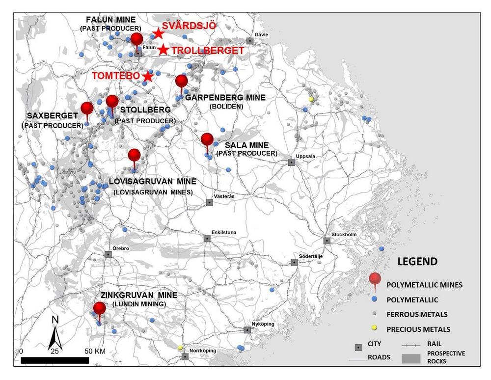 - Svärdsjö is located 25 km to the north of the Tomtebo Property, and contains similar host rocks, structure, alteration, and mineralization styles as the Garpenberg Mine, Historic Falun Mine, and the Tomtebo Property.
