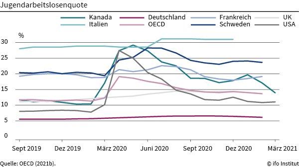 „Die Entwicklung in den einzelnen OECD-Ländern ist dabei sehr unterschiedlich“, sagt ifo-Forscherin Lavinia Kinne. Besonders in den USA, Kanada und Schweden war der Anstieg zu Beginn der Pandemie im Frühjahr 2020 besonders deutlich, ist danach jedoch wieder stark gesunken. Ähnlich verhält es sich bei Frankreich, obwohl dort der Anstieg nicht so stark war. Diese Entwicklungen entsprechen dem OECD-Durchschnitt. Ausnahmen bilden Italien und das Vereinigte Königreich. Der Anstieg der Jugendarbeitslosigkeit war hier zwar nicht so deutlich, hält aber bis heute an. Im Schnitt aller OECD-Länder waren junge Frauen häufiger von Jugendarbeitslosigkeit betroffen als Männer.