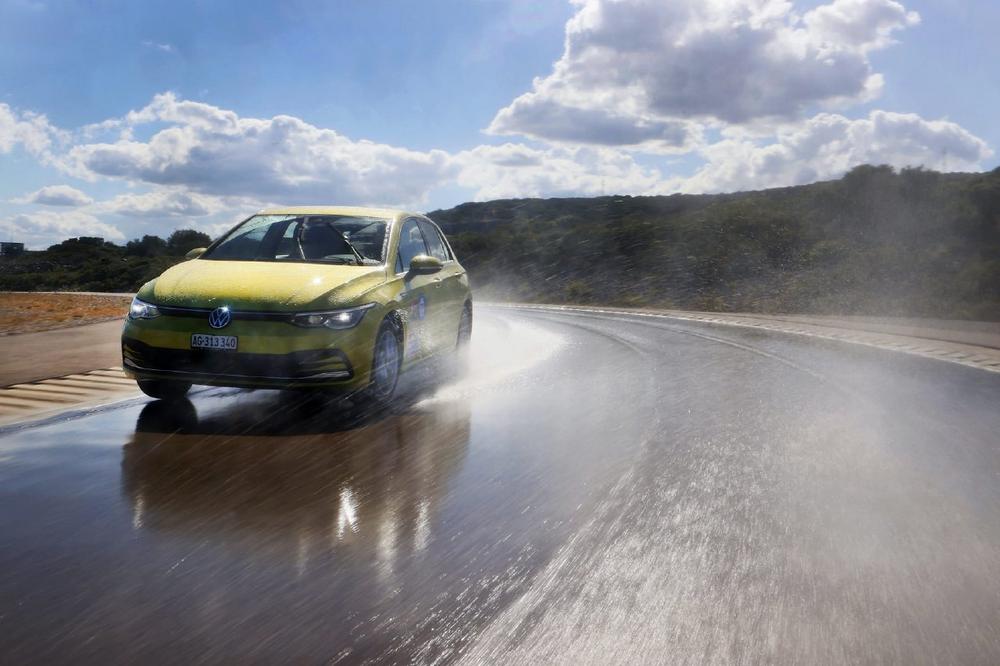 Szenario-Wechsel von minus 20 auf plus 30 Grad Celsius: Auf der Goodyear-Teststrecke im französischen Mireval zeigte der 17-Zoll-Allrounder die besten Werte. Vor allem beim Bremsen hatte er den besten Biss. Fürs Stehenbleiben auf nassem Asphalt und aus einer Geschwindigkeit von 80 Stundenkilometern brauchte der Golf auf 17-Zöllern 35,5 Meter, auf trockener Straße und aus 100 Stundenkilometern 41,5 Meter. Alle anderen Reifen benötigten beim Bremsen – nass und trocken – aber maximal auch nur anderthalb Meter mehr. Beim Aquaplaning bestätigte sich diesmal die Faustformel: Je breiter der Reifen, desto schneller schwimmt er auf. Blick aufs Ergebnisfeld: Der schmale 15-Zoll-Reifen verlor bei 90 Sachen die Haftung, während der breite 18-Zöller bereits bei 76,1 Stundenkilometern das Wasser nicht mehr verdrängen konnte. Die nasse Kreisbahn absolvierte der 17-Zöller in der kürzesten Zeit.