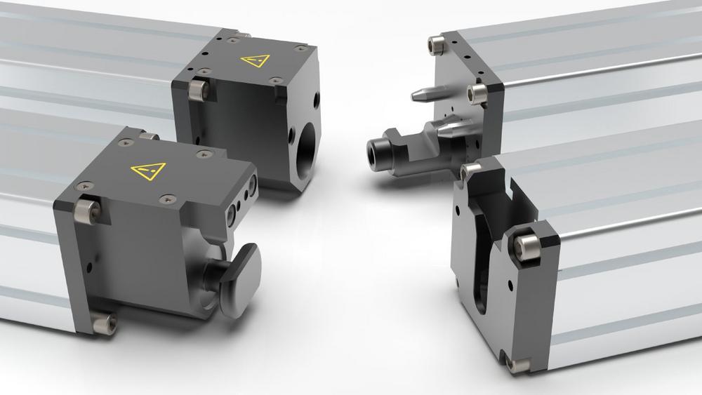 Die Typen PKH bzw. PKV können an alle gängigen Greiferschienenprofile angepasst werden. Neben der pneumatisch-automatischen Variante gibt es im Portfolio noch eine manuell-mechanische Version der Kupplungssysteme. Diese werden konventionell mit einer Schraube fixiert. Sie verfügen für die manuelle Spannkraftaufbringung über einen Doppelgewindetrieb, welcher den Spannkolben betätigt. Die Kupplungen schließen selbst fünf Millimeter breite Spalte zwischen Aktiv- und Passivteil selbsttätig und sind elektrisch abgefragt. Der Einbau in die Greiferschienen erfolgt entweder direkt oder über einfache Adapterplatten. Zusätzlich können auf die automatischen Systeme Energiekupplungen aufgesetzt werden. ‚Mit dem Schließvorgang stellen diese die elektrische und die pneumatische Verbindung zur Wechselschiene her.‘ Die Vorteile liegen auf der Hand: Die pneumatische Lösung TYP PKH-P bzw. PKV-P ist leicht und wie hydraulische Systeme unabhängig von Stromausfällen, ist aber wartungsarm und ökonomisch wie Kupplungen mit Elektroantrieb. Im Einsatz sorgen die Greiferkupplungen für deutlich kürzere Rüstzeiten – und erhöhen so die Produktivität der gesamten Anlage.