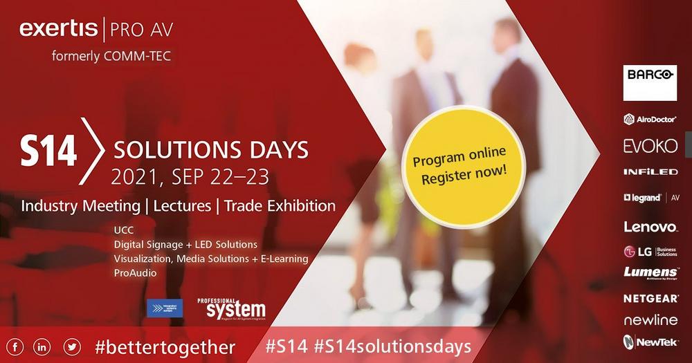 Follow us on social media and stay up to date (LinkedIn, Facebook, Twitter, Xing, YouTube). Feel free to use the hashtags #s14, #s14solutionsdays and #bettertogether – become part of the Exertis Pro AV community.