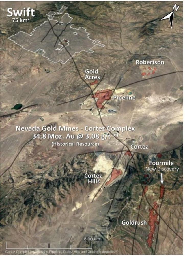 Swift liegt im Cortez-Bezirk des historischen Trends Battle Mountain – Eureka, etwa 30 km südlich der Stadt Battle Mountain in Lander County, Nevada. Das 75 km² große Konzessionsgebiet liegt im Streichen der Lagerstätten Pipeline, Cortez Hills und Goldrush (siehe unsere VRIFY-Präsentation über Swift), die den mehrere Millionen Unzen umfassenden Cortez-Komplex einschließen, der sich im Besitz von Nevada Gold Mines (ein Joint Venture zwischen Barrick Gold Corp. und Newmont Corp.) befindet. Im Rahmen seines Phase-I-Bohrprogramms 2020 durchteufte Ridgeline das für die untere Gesteinsplatte typische Karbonatgestein im Bergbaurevier Cortez, und auch die Formation Wenban (das primäre Wirtsgestein sämtlicher Goldlagerstätten mit mehr als 5,0 Millionen Unzen im Bergbaurevier Cortez), die in der Vergangenheit im Projektgebiet falsch identifiziert worden war. Die Entdeckung der gut erhaltenen Formation Wenban war ein wichtiger technischer Meilenstein für das Projekt und ist eine Bestätigung für das Entdeckungspotenzial im Projekt Swift auf Distriktebene.