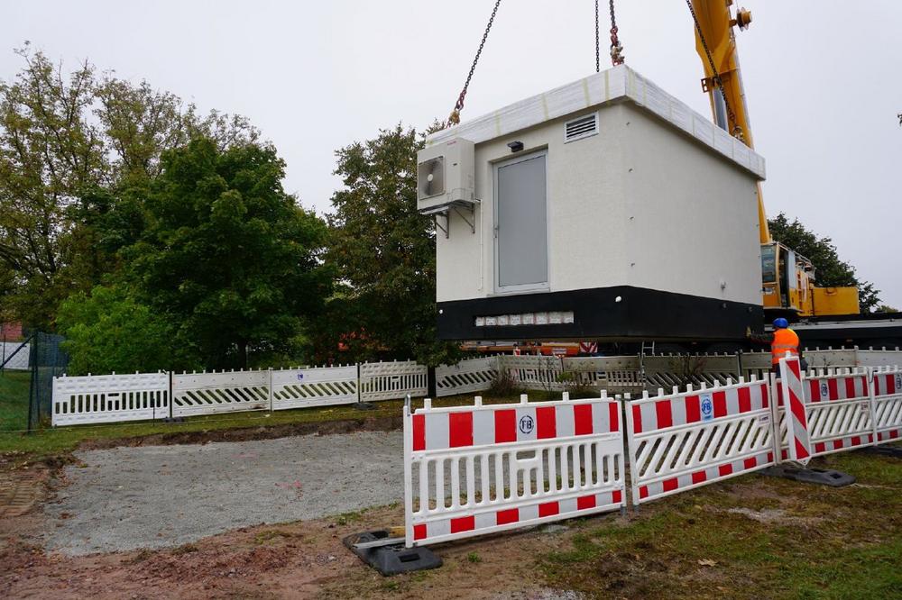 Bereits am 18.08.2021 wurde das erste PoP-Gebäude für den Bauabschnitt 3 im Projektgebiet 1 in Wust geliefert und erfolgreich platziert. Nun folgte das zweite PoP-Gebäude in Klietz. Die Mitarbeiter des ZBA, die Verbandgemeindebürgermeisterin Elbe-Havel-Land Steffi Friedebold, der Bürgermeister der Gemeinde Klietz Jens Meiering und Mitarbeiter der Firma Aytac Bau GmbH staunten nicht schlecht als das ca. 32 Tonnen schwere Fertiggebäude bereits 20 min nach Ankunftszeit ohne Komplikationen stand.