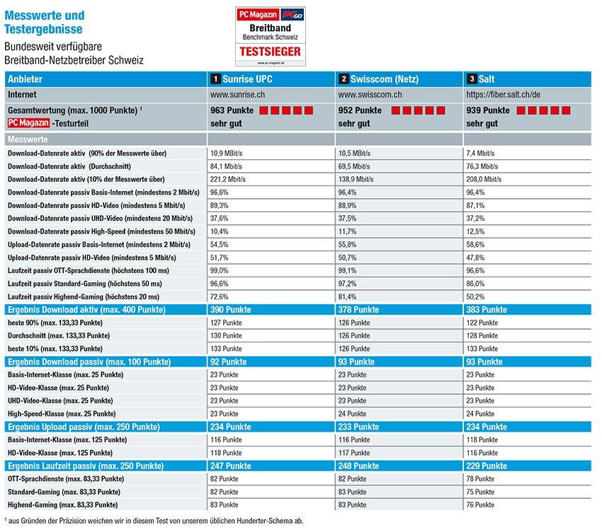 „Dreimal die Gesamtnote ‚sehr gut‘ mit exzellenten Punktzahlen – viel besser geht’s nicht. Keine Frage: Die drei landesweiten Festnetzanbieter der Schweiz zeigen in unserem nutzerorientierten Breitband-Benchmark, dass sie offensichtlich durchweg einen Super-Job machen. Die neuformierte Sunrise UPC hat unserer Auswertung zufolge noch einen Tick mehr Speed in ihren Breitbandkabel- und Glasfasernetzen und darf sich damit in diesem Jahr als Gesamtsieger feiern lassen. Geht es um die in der Spitze bereitgestellten Top-Datenraten überrascht nicht, dass Salt dem Gewinner dicht auf den Fersen ist. Dazu tragen sicher auch deren Glasfaserinfrastruktur und die 10 Gbit/s-Angebote in Ballungsräumen wie Zürich bei“, sagt Joachim Bley, Autor des PC Magazins.