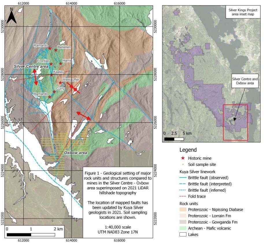 Die Bohrziele dieses Programms konzentrieren sich in erster Linie auf das neu identifizierte Gebiet Oxbow, das mit dem historischen Minenlager Silver Centre in Verbindung steht. Das Gebiet Oxbow ist eine relativ unerprobte Zone, die von Kuya als südliche Fortsetzung des Mineralisierungssystems der Minen im Gebiet Silver Centre interpretiert wird, in dem zwischen 1908 und 1965 mehr als 23 Millionen Unzen Silber aus mehreren historischen Minen, einschließlich Keeley und Frontier, gefördert wurden (siehe Abbildung 1).