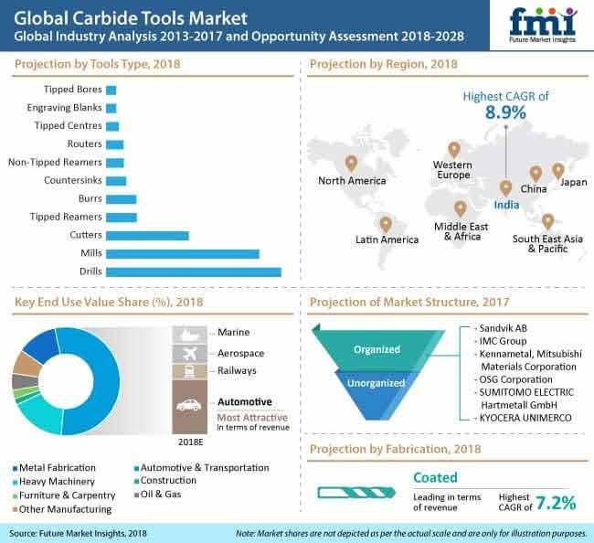 Escalating utilization of carbide tools for job-shop applications in metal fabrication, general automotive applications, and high-speed cutting applications will predominantly push sales prospects of carbide tools, as per FMI’s research. While adoption of carbide tools for automotive and fabrication end-use applications holds over 55% share in the total market revenue, growing adoption by heavy machinery manufacturers is also underpinning significant revenue generation in carbide tools market.