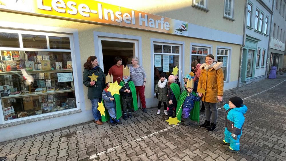 Mit dem bekannten Lied „Wir sind die drei Könige“ von Kurt Mikula machte die kleine Gruppe an verschiedenen Stationen, so auch beim Optiker, bei der Bücherei und Bäckerei Bielert in der Stadt Halt, um zu singen Spenden zu sammeln und dem Haus Segen für das Jahr zu bringen. Höhepunkt war die Begrüßung bei Bürgermeisters Mike George, Frau Eckardt und Frau Breternitz von der Stadtverwaltung Bad Blankenburg. Beim Bäcker erhielten die Kinder verschiedene Plätzchen. „Wir haben durch die Aktion eine kleine Geldspende erhalten, die wir unserem Pfarrer Andreas Kämpf für die Unterstützung der Hochwasserregion in der Eifel übergeben haben. Die Kinder hatten Spaß, haben den Menschen in der Stadt Freude bereitet und konnten sogar Geld für andere sammeln. Ein guter Tag und für mich ein toller Einstand“, fasst die neue Leiterin des Evang. Kindergartens, Jacqueline Wenzel, zusammen.