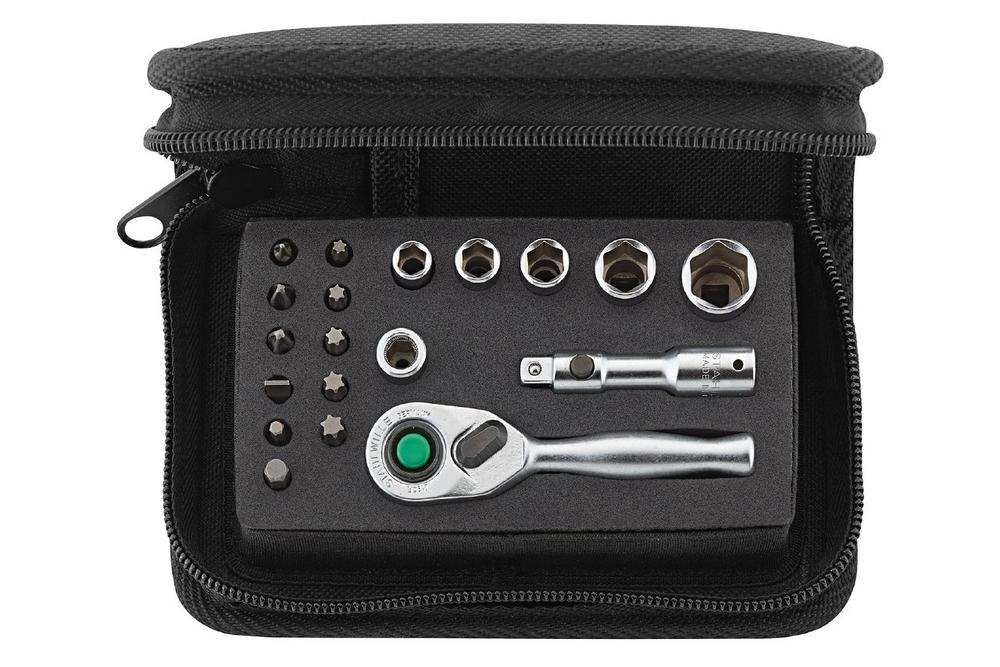 Das Softcase aus strapazierfähigem Gewebe ist nur 10 x 15 Zentimeter groß, passt in jeden Servicekoffer oder in großformatige Taschen der Arbeitskleidung und ist immer schnell zur Hand. Feinzahn-Knarre und Zubehör stecken fest und zugleich leicht entnehmbar in einer vorgeformten Hartschaumeinlage.