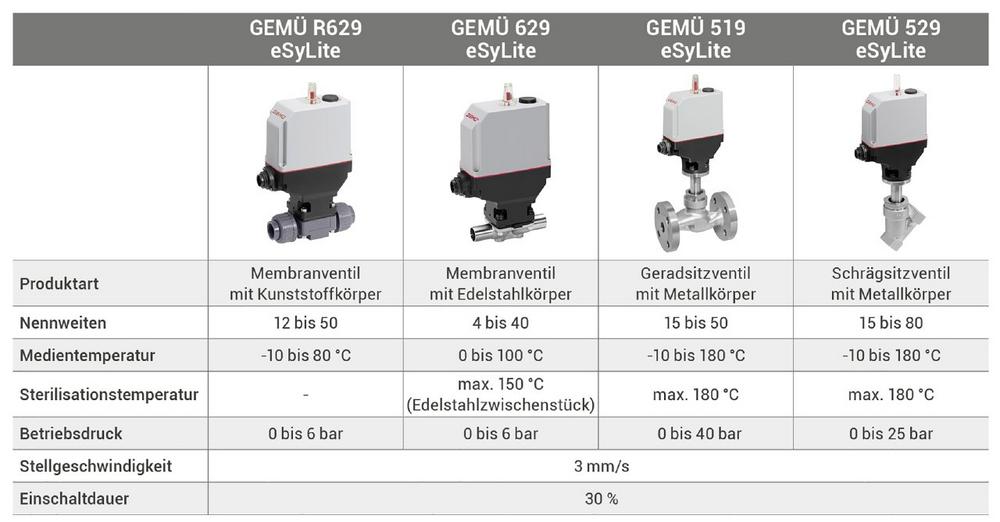 Neben dem bereits bestehenden Kunststoff Membranventil GEMÜ R629 eSyLite stehen nun auch das Membranventil GEMÜ 629 mit Edelstahlkörper sowie die Sitzventile GEMÜ 519 und 529 für einfache, elektromotorisch betätigte Auf-/Zu-Anwendungen zur Verfügung.