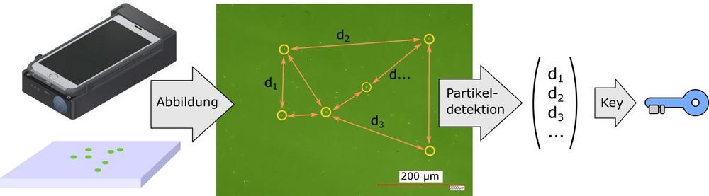 Diesen Bedarf der Industrie will das Konsortium aus drei renommierten Forschungseinrichtungen in den kommenden zwei Jahren durch ein innovatives Lösungskonzept adressieren. Zentrale Idee ist es, Markierungen aus zufällig verteilten Mikropartikeln auf die Formteiloberflächen bereits während des Spritzgießens aufzubringen und so kontrolliert eine Individualisierung durch die jeweiligen Zufallsstrukturen herbeizuführen (Abb. 1). Nach der Formgebung können die Bauteile registriert und idealerweise jederzeit durch erneutes Auslesen der Markierung wiedererkannt werden. Hierzu werden fluoreszierende Mikropartikel eingesetzt, um die Auslesung der Markierungen bspw. mittels einfacher Handykameras zu ermöglichen. Das angestrebte Verfahren kann dadurch direkt mit bereits kommerziell verfügbaren Detektionssystemen kombiniert werden.
