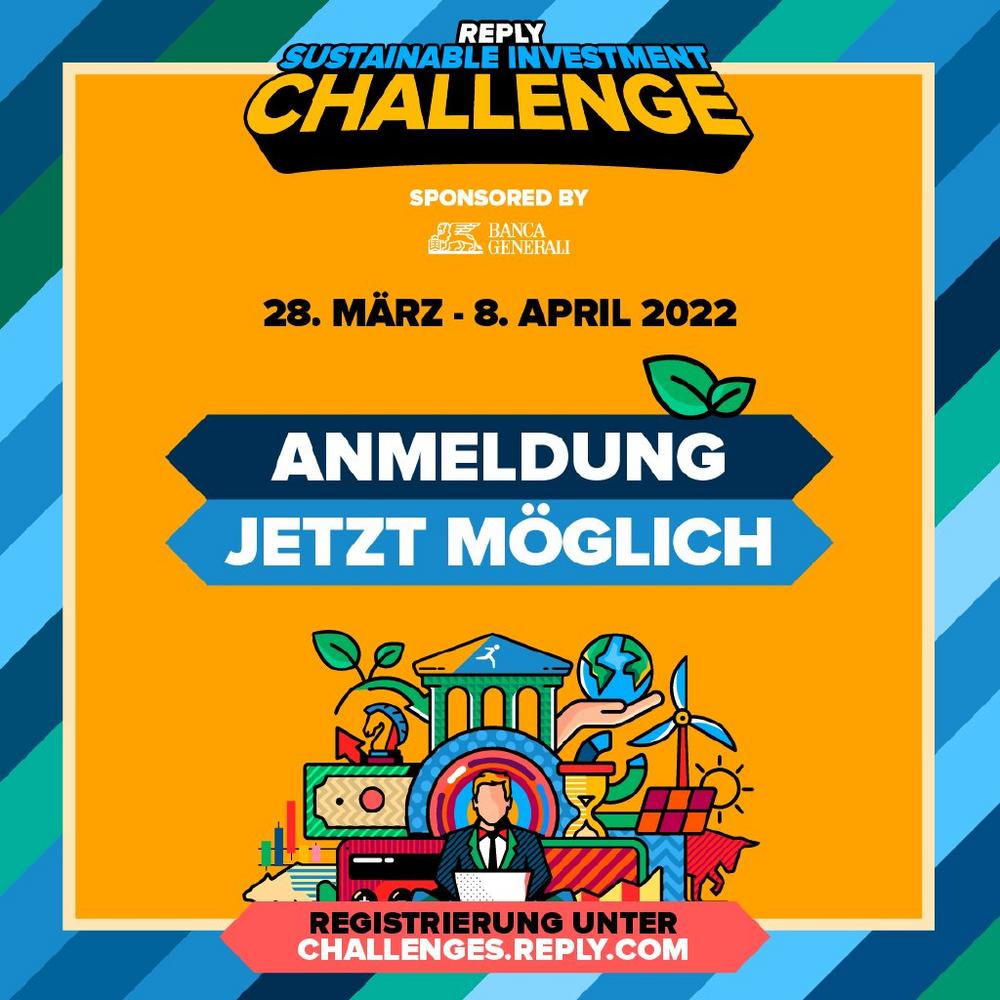 Die Anmeldung für die Reply Sustainable Investment Challenge ist bis zum 25. März 2022 möglich. Weitere Informationen sind unter challenges.reply.com zu finden.