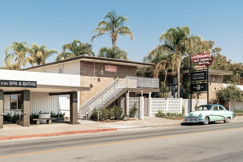The design of Dr. Wilkinson’s Backyard Resort & Mineral Springs reflects its long-standing history as a mineral springs and mud bath destination, blending the original buildings’ mid-century modern and Victorian styles through a cohesive exterior color scheme and interior design. A focus is placed on calming neutral colors, augmented with organic materials and complemented by playful pops of color, including salmon detailing in guestrooms and turquoise awnings outside. The historical significance of Dr. Wilkinson’s is also reflected through the retention of the original neon street sign as well as Doc’s favorite car, a 1952 Buick Special, that stays parked in front of the property. The artworks on display were also a key part of the design process; pieces were meticulously curated for each area to reflect both the town and property’s past and present. For example, Edy Wilkinson’s mosaics are found throughout the hotels, a local painter created a site-specific mural in the pool area, and behind the front desk hang 52 clay disks—handmade by local artist Will Callnan as a nod to the resort’s founding in 1952—that mimic the mud used in onsite baths and treatments.