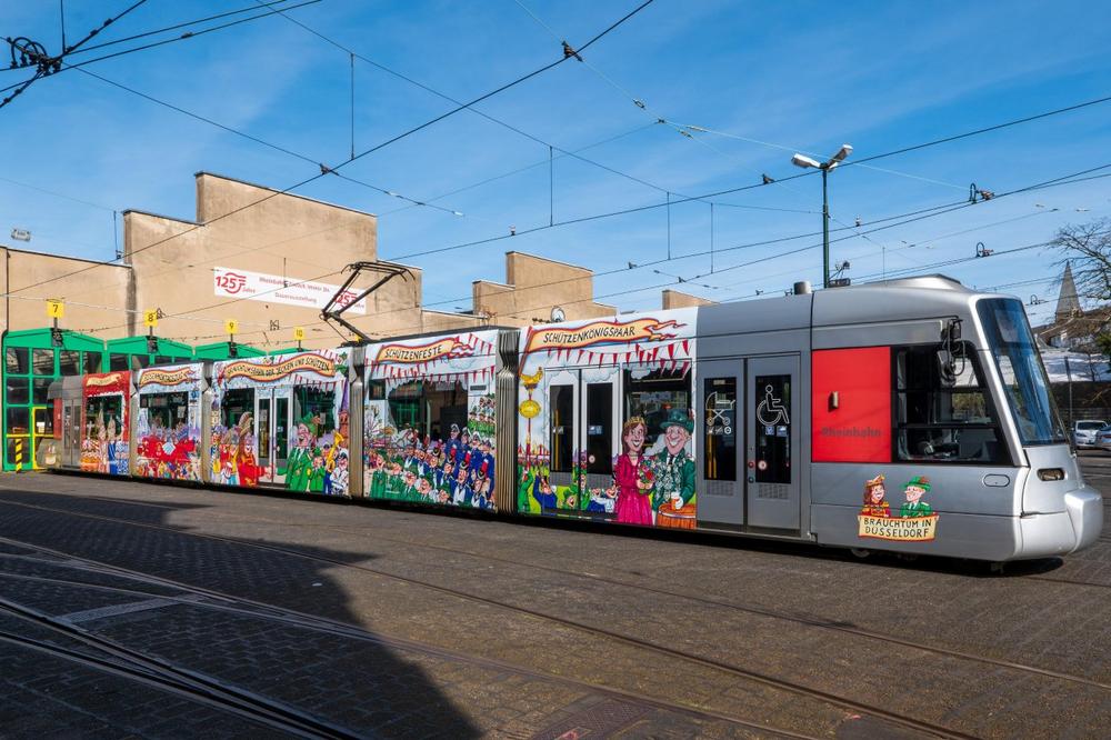 Die Kirmes samt Riesenrad und Autoscooter ist natürlich auch eines der Motive, die die Bahn schmücken. Schützenfeste, Umzüge, der Bergische Löwe als Rosenmontagswagen, die Goldene Mösch, Prinzen- und Schützenkönigspaare, Musikgruppen und lachende Jecken und Schützen paradieren über die gesamte Länge des Fahrzeugs. Ein Gläschen Alt hat sich auch darauf versteckt und auch der Rheinturm und die Gehry-Bauten. So sind Tradition, Brauchtum, Sehenswürdigen und Wahrzeichen unserer Stadt vereint und auch das Lebensgefühl eingefangen, das Düsseldorf ausmacht – und zu dem die Rheinbahn genau wie das Sommer- und das Winterbrauchtum ihren wichtigen Part beitragen.