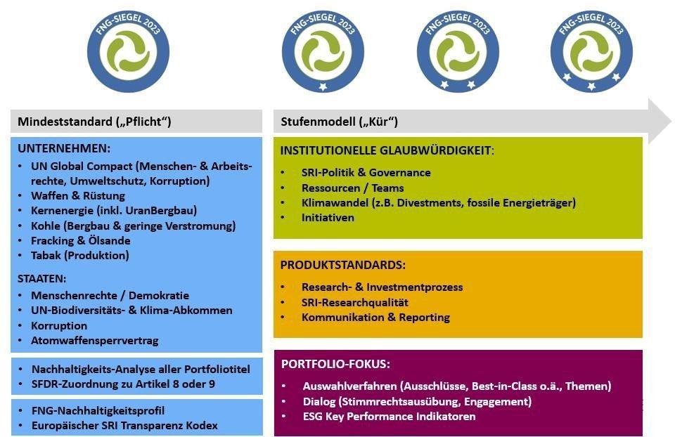 Das FNG-Siegel ist der Qualitätsstandard für nachhaltige Investmentfonds im deutschsprachigen Raum. Die ganzheitliche Methodik des FNG-Siegels basiert auf einem Mindeststandard. Dazu zählen Transparenzkriterien und die Berücksichtigung von Arbeits- & Menschenrechten, Umweltschutz und Korruptionsbekämpfung wie sie im weltweit anerkannten UN Global Compact zusammengefasst sind. Auch müssen alle Titel des jeweiligen Fonds komplett auf Nachhaltigkeits-Kriterien hin analysiert werden und das Produkt eine explizite Nachhaltigkeits- Strategie vorweisen. Tabu sind Investitionen in Atomkraft, Kohlebergbau, bedeutsame Kohleverstromung, Fracking, Ölsande, Tabakproduktion sowie Waffen & Rüstung.