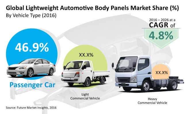 Automotive body panels such as bumpers, hoods, door panels, roof, and trunk lids are manufactured using lightweight materials such as high-strength steel, aluminium, magnesium, and polymers and composites in order to provide desired strength with reduced weight. Lightweight automotive body panels help improve fuel economy and performance of vehicles by reducing the overall weight of the vehicle. About 25% reduction in automobile weight saves 3.5 to 5.0 tonnes of greenhouse gas emissions over the lifetime of an average car. Manufacturers today are adopting lightweight body panels in vehicles in order to comply with government regulations pertaining to greenhouse gas emissions.