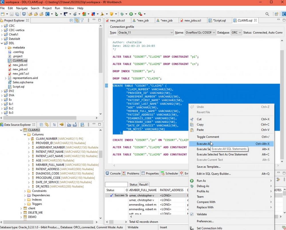 IRI Workbench™ ist die grafische Benutzeroberfläche (GUI) für alle IRI-Produkte und vieles mehr. Neben vielen anderen Dingen kann IRI Workbench eine Verbindung zu den meisten Datenbanken herstellen. Es gibt Assistenten und Editoren, mit denen SQL-Skripte, einschließlich DDL, erstellt, bearbeitet und ausgeführt werden können. Zu den DDL-Anweisungen, die generiert werden können, gehören solche zum Erstellen, Ändern und Löschen von Tabellen, Schlüsseln, Indizes und Beschränkungen.