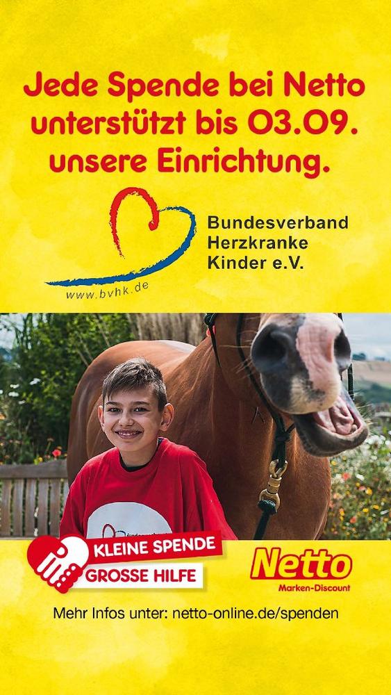 Erstmals ermöglicht Netto Marken-Discount mit seiner Spendeninitiative 13 Wochen lang die zeitgleiche Unterstützung von 20 überregionalen Hilfsorganisationen in Deutschland: In rund 240 Netto-Filialen in Teilen von Nordrhein-Westfalen und Rheinland-Pfalz steht der Bundesverband Herzkranke Kinder e.V. als Spendenpartner im Fokus der Aktion. Der Lebensmittelhändler gibt damit seinen Kundinnen und Kunden die Chance, sich vom 7. Juni bis zum 3. September 2022 an der Kasse oder am Pfandautomaten für den Bundesverband Herzkranke Kinder e.V. zu engagieren.