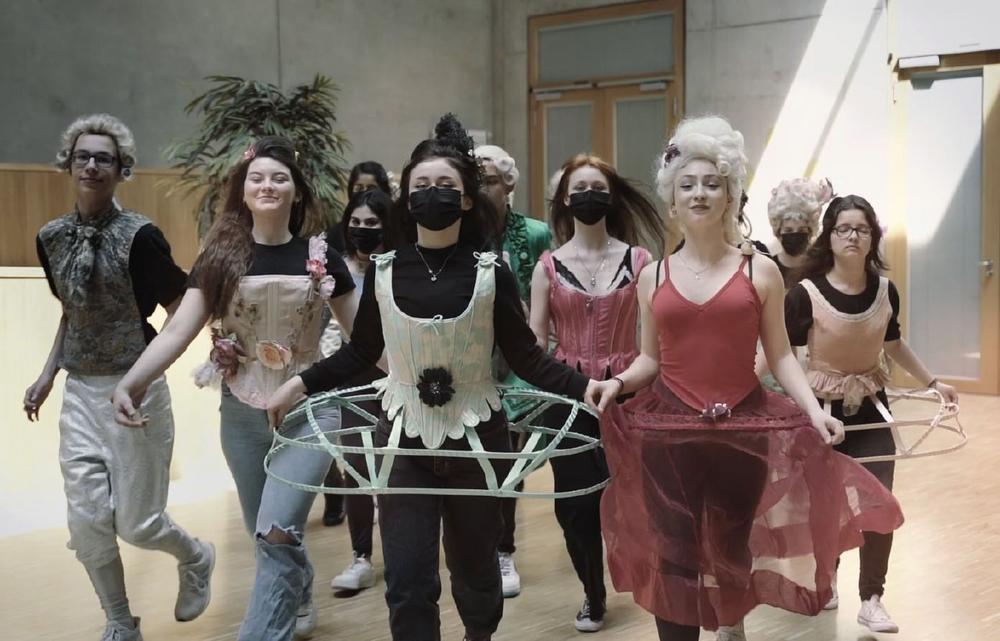Ein Jahr lang haben sich nun rund 60 Schüler*innen des sechsten und neunten Jahrgangs der Partnerschule in verschiedenen Workshops zu den Themen Tanz, Szene und Kunst mit dem Komponisten Wolfgang Amadeus Mozart beschäftigt, professionell angeleitet von Adelina Nigra (Tanz), Marijke Malitius (Regie), Martina Flößer (Rüstmeisterin) sowie Dramaturgin Sandra Paulkowsky aus dem Aalto-Theater. Entstanden ist ein kunstvoll gestalteter fünfzehnminütiger Kurzfilm, der einen Schultag zeigt, in den Mozart „hineinstolpert“. Spannende „Musikmaschinen“, die für ihn nicht von dieser Welt zu sein scheinen, sowie ein manchmal kaum verständliches Vokabular, begegnen dem aus der Zeit gefallenen Komponisten. Für die musikalische Gestaltung des Films sorgte das Mannheimer Streichquartett (Arrangement: Heribert Feckler). Gedreht und produziert wurde er von der Videokünstlerin Valeria Lampedova.