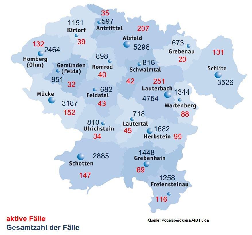 Laut Robert-Koch-Institut (RKI) liegt die Sieben-Tage-Inzidenz im Vogelsbergkreis bei 1057,8 – für Hessen bei 762,0. Die Sieben-Tage-Inzidenz der Hospitalisierungen in Hessen weist das RKI mit 5,51 aus.