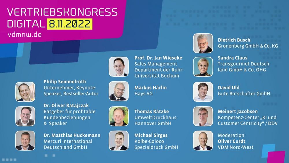 Am 8. November 2022 geben Top-Speaker und Vertriebsverantwortliche aus der Branche in ihren Vorträgen Impulse für mehr Erfolg im Vertrieb und betrachten zentrale Herausforderungen aus unterschiedlichen Perspektiven. Dank insgesamt sechs parallel stattfindender Diskussionsforen („Sessions“) haben die Teilnehmer die Möglichkeit, Themen individuell auszuwählen und zu diskutieren. Die virtuelle Event-Plattform sorgt dafür, dass sich die Kongressteilnehmer in verschiedenen Räumen aufhalten, ihre Fragen an die Experten stellen, mit anderen Besuchern vernetzen sowie die virtuellen Messestände besuchen können.