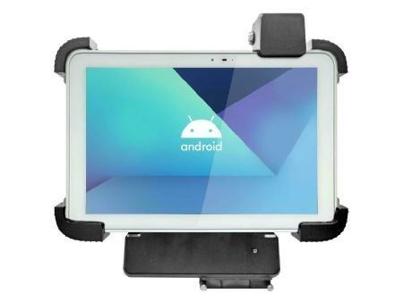 Das Tablet lässt sich einfach mit einer Hand aus der Halterung entnehmen, wieder einstecken und verriegeln. Durch die unterseitigen Pogo-Pins am Tablet verbinden sich die Schnittstellen der Halterung beim Einsetzen automatisch. Das Tablet ist zudem durch ein integriertes Schloss an der Halterung gegen unbefugte Entnahme geschützt.