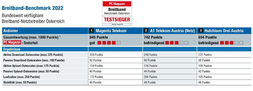 Magenta Telekom gewinnt mit 845 von 1.000 Punkten und der Note „gut“ zum vierten Mal in Folge. Insbesondere in den aktiv angestoßenen Geschwindigkeitstests konnte sich der Anbieter deutlich nach oben absetzen. Die nutzerseitig maximal verfügbaren Datenraten der untersuchten Internet-Anschlüsse waren in beiden Übertragungsrichtungen nicht zu toppen. Dieser Geschwindigkeitsvorteil gab den Ausschlag für Platz 1 und einen deutlichen Punktevorsprung. Nur fünf Punkte fehlen zur Gesamtnote „sehr gut“.