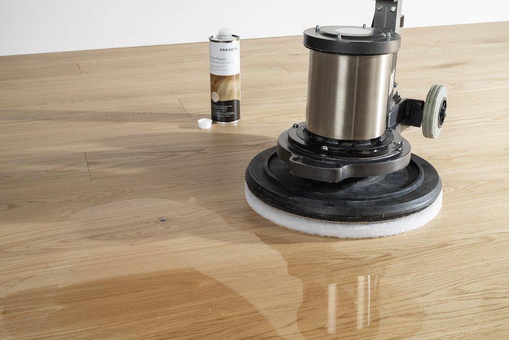 Fällt die Wahl auf Öl statt auf Lack gilt es in jedem Fall zu bedenken: Die Unterhaltspflege ist etwas aufwändiger als bei lackiertem Parkett. So sollte mit normalem Öl behandelter Boden öfter nachgeölt werden, bei Hartwachs-Ölen ist dies seltener notwendig. Je nach Beanspruchung und Belastung des Parketts sollte das gut geölte Parkett regelmäßig mit den passenden Pflegemitteln behandelt werden. Das stärkt den Schutz und ist gut für den dauerhaften Werterhalt des Parketts. Kommt es doch zu Beschädigungen, so lassen sich bei naturfarben geöltem Parkett die in Mitleidenschaft gezogenen Partien in der Regel gut ausbessern, eine partielle Renovierung ist an den notwendigen Stellen ansatzfrei möglich. Kratzer oder Druckstellen können im Vergleich zum lackierten Parkett zwar leichter in das Holz eindringen, können aber auch wieder entfernt werden. Verschmutzungen oder vergossene Getränke wie Kaffee oder Rotwein lassen sich bei rechtzeitigem Handeln gut entfernen, so auch bei lackiertem Parkett.