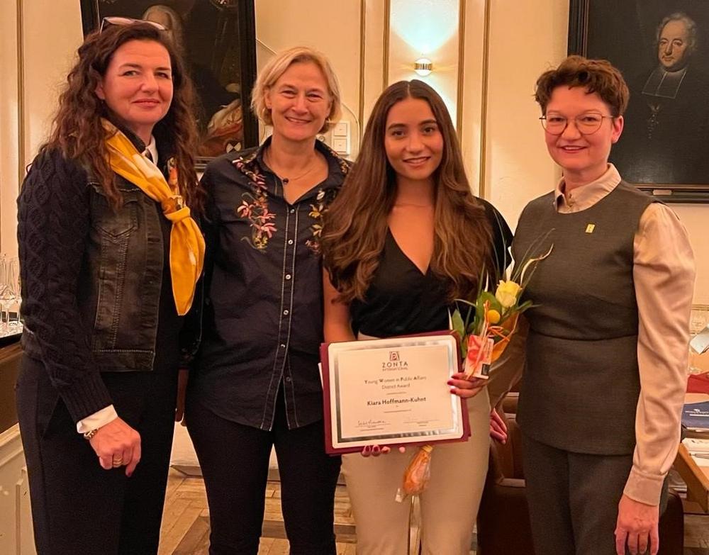 Kiara Hoffmann-Kuhnt gewinnt den „Young Women in Public Affairs Award“ (YWPA) und Maren Hülsmann wird mit dem „Amelia Earhart Fellowship“ ausgezeichnet. Beide erhielten im Bürgerspital in Würzburg die Urkunden aus den Händen der Zonta-Governor Heike Schimdt (Zonta District 14) überreicht.