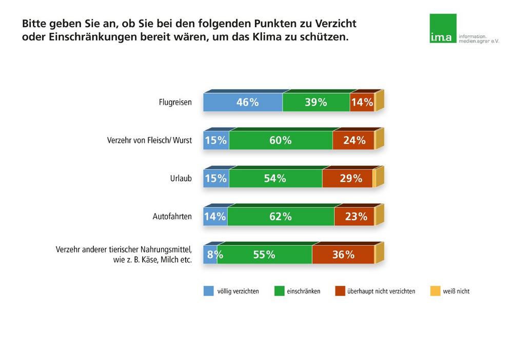 Mehrheitlich sind die Verbraucher beim Lebensmittelkonsum zu Einschränkungen bereit, wenn sie dadurch das Klima beeinflussen könnten. Sechzig Prozent können sich vorstellen, weniger Fleisch und Wurst zu konsumieren, 55 Prozent weniger andere tierische Nahrungsmittel. Andererseits lehnen letzteres auch mehr als ein Drittel der Verbraucher (36 %) kategorisch ab.