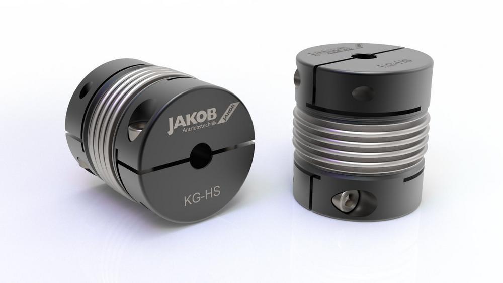 With the new KG-HS coupling series, JAKOB Antriebstechnik offers a high-speed version of the popular KG metal bellows coupling. Assembly and disassembly are no longer difficult, even in cramped installation conditions. The rotationally symmetrical clamping hub ensures optimum balancing quality, the secure connection between the bellows and the hub is guaranteed with the micro-plasma welding process. The new series offers nominal torques of 5-1000 Nm at a temperature range of -40°C to 350°C.