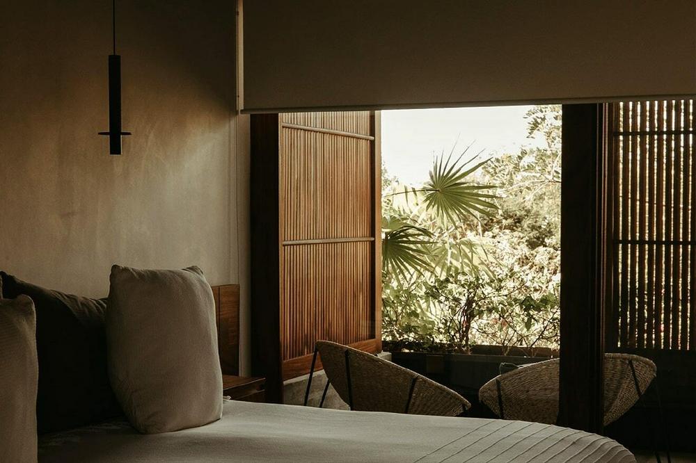 Hotelito was conceived for the conscious explorer, created to provide the luxury of space, time, and opportunities to nurture innovation and redefine what it means to travel, live, and work in pure nature. Andrés and his team at Andrés Saavedra Design (ASD) oversaw both the architectural plan and interior design, with a primary focus on integrating the buildings into the existing environment without altering, affecting, or impacting the land and its ecosystems. Landscape architect Juan Pablo Gomez Servin provided consultation on sustainable designs and waste management systems, while the Mexico City-based team at Fénix Farms offered expert advice on regenerative agriculture. With their input, a low-density plan was created and Hotelito can operate entirely on solar power. Other features include rooftop gardens to promote cooler indoor spaces, robust compost and soil regeneration initiatives, and rainwater harvesting and grey water recycling systems for feeding onsite gardens. Biomass collected during beach clean-ups is also repurposed as mulch, and underwater there’s a hidden artificial reef just beyond the break—the reef was initially built to shape A-frame waves for surfing, but it also aids in the generation of healthy and natural coral reef habitats.