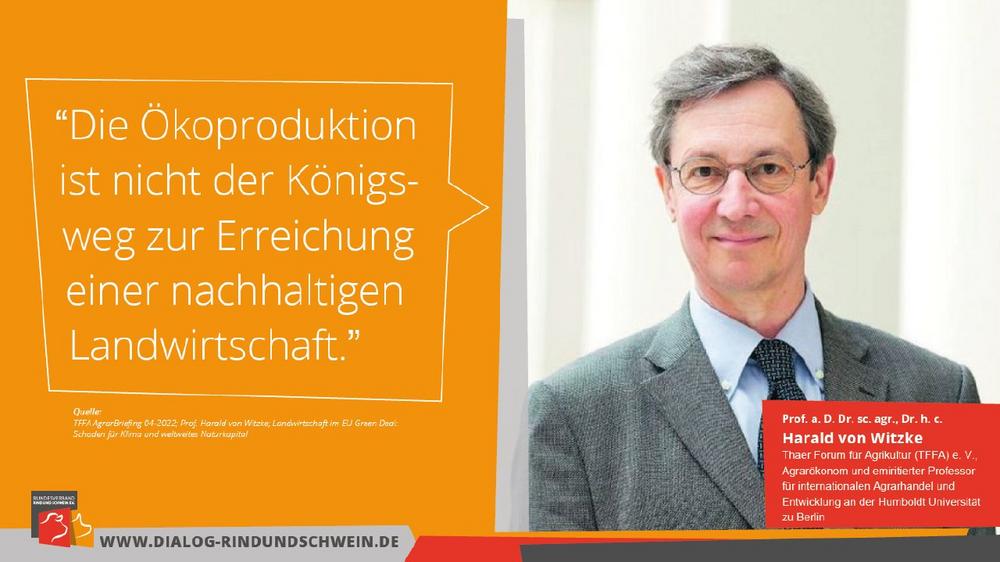 So wichtig der Klimaschutz auch ist, die vorgeschlagenen Maßnahmen könnten global betrachtet genau das Gegenteil von dem bewirken, was die EU eigentlich erreichen will. Darauf weist der Agrarökonom Prof. Dr. Harald von Witzke vom Thaer Forum für Agrikultur (TFFA) e. V. und emeritierter Professor für internationalen Agrarhandel und Entwicklung an der Humboldt-Universität zu Berlin hin. Experten kritisieren die Fokussierung des Green Deal auf die Auswirkungen innerhalb der EU. Der Ökolandbau weist ein deutlich geringeres Ertragsniveau als der konventionelle Landbau auf. Dies führt weltweit zu einer zusätzlichen Ausdehnung der landwirtschaftlichen Nutzflächen. Dadurch werden global per Saldo weit mehr Klimagase emittiert als in der EU eingespart, weiterhin wird Biodiversität zerstört.
