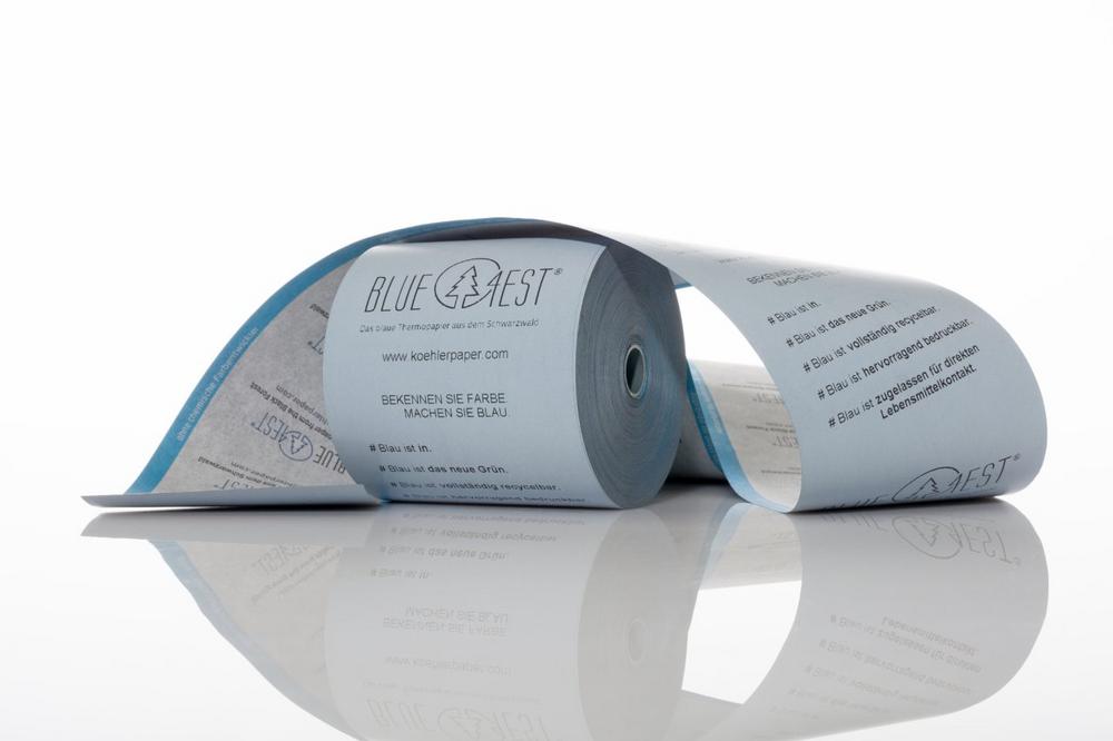 Traditionelles weißes Thermopapier, wie etwa der klassische weiße Kassenzettel, ist ein sogenanntes gestrichenes Papier, also ein Papier, auf das eine Beschichtung aufgetragen wird. Darin enthaltene Stoffe reagieren auf Hitze und verfärben sich schwarz. Dies ist eine chemische Reaktion, die nur durch die Anwendung von Farbbildnern und Farbentwicklern möglich ist. Dabei kann es sich um phenolhaltige und phenolfreie Stoffe handeln. Insbesondere phenolhaltige Farbentwickler gelten im Hinblick auf ihre Nachhaltigkeit nicht als völlig unbedenklich, weshalb die Experten von Koehler Innovation & Technology eine neue Alternative zum Standard-Thermopapier erfunden haben: Das blaue Blue4est® Kassenzettelpapier. Das Funktionsprinzip der blauen Generation von Thermopapieren ist ein anderes: Das Blue4est® Thermopapier wird mit einer schwarzen Farbe bestrichen, auf welche wiederum eine opake, undurchsichtige, weiße Schicht aufgetragen wird. Durch die Hitzeeinwirkung des Thermodruckkopfs wird die obere weiße Schicht transparent, die darunter liegende schwarze Schicht sichtbar. Dies ist ein physikalischer Prozess, bei dem das Farbspektrum, das von der Papieroberfläche reflektiert wird, die eigentlich weiße Schicht blau erscheinen lässt, so wie bei der Oberfläche von Wasser. Deshalb ist der Kassenzettel blau.