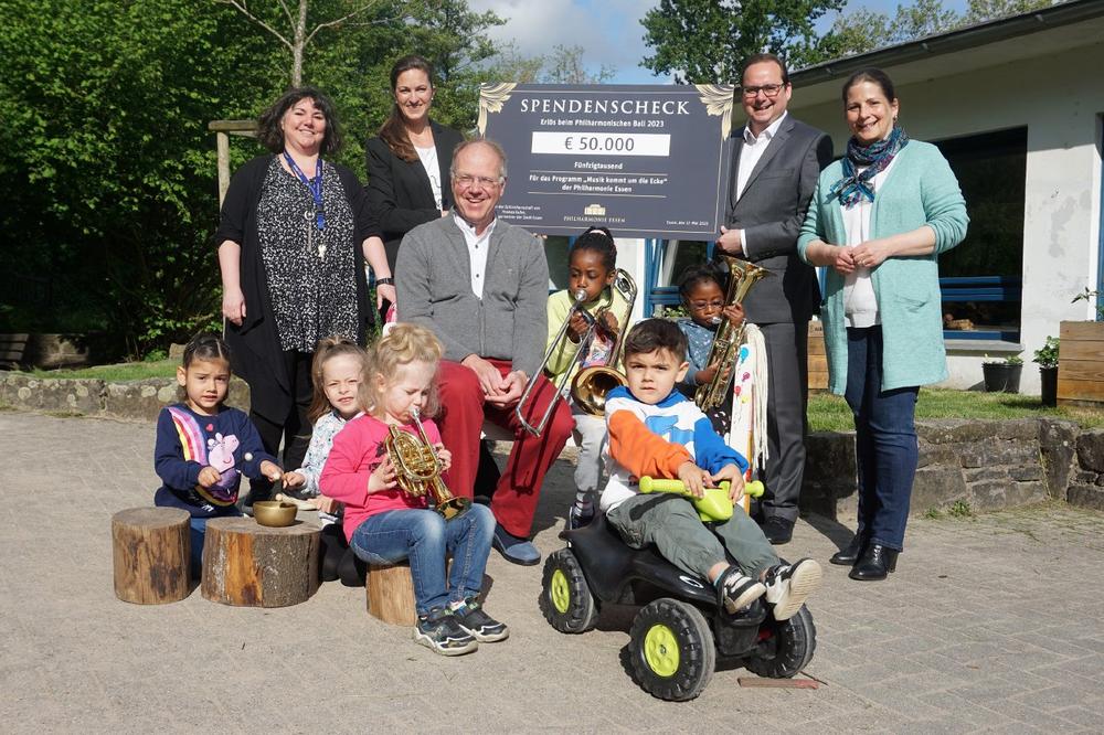 Der Philharmonische Ball im vergangenen Februar war nicht nur ein festliches Ereignis, sondern diente auch einem guten Zweck: Der Erlös von 50.000 Euro kommt dem Projekt „Musik kommt um die Ecke“ zugute, mit dem die Philharmonie Essen Kinder aus überwiegend sozial benachteiligten Essener Stadtteilen unterstützt und ihnen erste Erfahrungen mit klassischer Musik ermöglicht. Symbolisch überreichten Marie Babette Nierenz, Künstlerische Leiterin der Philharmonie, und Merja Dworczak, Leiterin Education, am heutigen Vormittag in der katholischen Kindertagesstätte St. Thomas Morus „Vogelheimer Nest“ einen Scheck mit der entsprechenden Summe. Anwesend war auch Essens Oberbürgermeister Thomas Kufen als Schirmherr des Philharmonischen Balls. Die Kita im Essener Stadtteil Vogelheim gehört zu den mittlerweile 22 Einrichtungen, die vom Projekt „Musik kommt um die Ecke“ bislang profitiert haben.