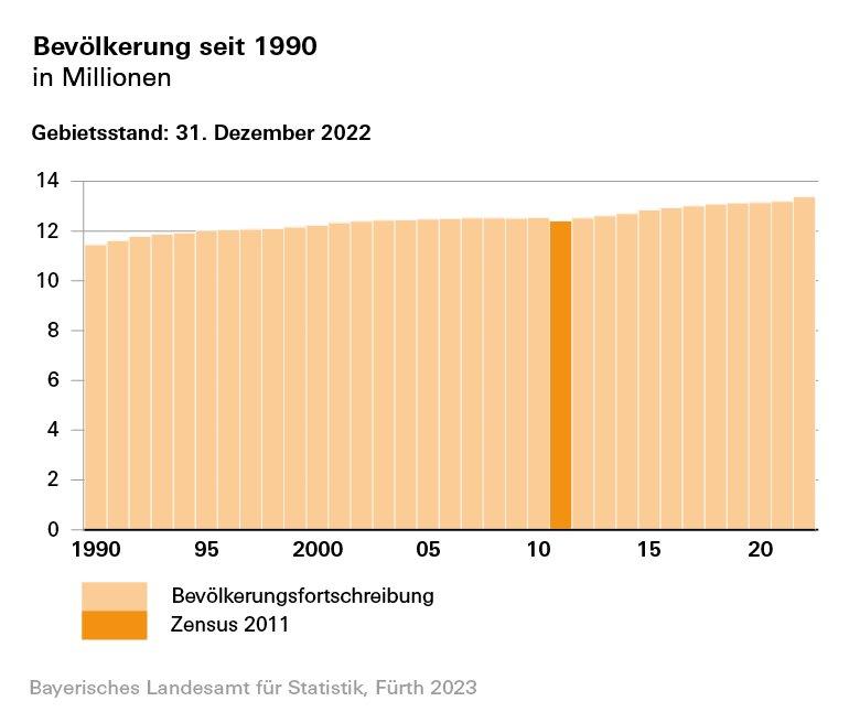 Am 31. Dezember 2022 lebten im Freistaat 13 369 393 Menschen und damit 192 404 mehr als Ende des Jahres 2021, wo es noch 13 176 989 Personen waren. Seit der Wiedervereinigung im Jahr 1990 hat es in Bayern keinen vergleichbaren Anstieg der Einwohnerzahlen innerhalb eines Jahres gegeben. Im Durchschnitt lag die Bevölkerungszunahme im Freistaat in den letzten zehn Jahren bei knapp 73 400 Personen pro Jahr. *