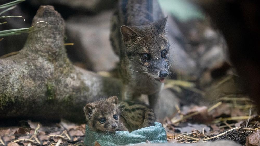 Der Neunkircher Zoo freut sich seit drei Wochen über neuen Nachwuchs. Am 26.05.2023 entdeckte eine Tierpflegerin des zuständigen Reviers am frühen Morgen das Fanaloka-Jungtier. Das Geschlecht des Jungtieres ist noch unbekannt und dementsprechend gibt es noch keinen Namen. Mutter Hanitra ist eine sehr fürsorgliche Mutter und verbringt noch viel Zeit mit dem Nachwuchs in ihrer Box. Dennoch haben Besucherinnen und Besucher des Neunkircher Zoos bereits jetzt die Chance, das Jungtier zu entdecken. Ab und an drehen Mutter und Jungtier eine kleine Runde durch das Gehege, sobald Mutter Hanitra frisst, erlaubt sie ihrem Nachwuchs auch ein paar Schritte allein.