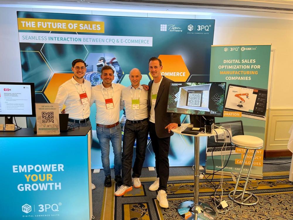 Bevor am Montagmorgen der Startschuss für das Event fällt, haben die Teilnehmenden am Vorabend die Gelegenheit, sich im Rahmen einer moderierten Icebreaker Session über individuelle Erfahrungen sowie Pain Points auszutauschen und wertvolle Kontakte zu knüpfen. 17 Aussteller warten dieses Jahr im Ausstellungsraum mit ihrem Angebot auf. Darunter auch die Plan Software, die gemeinsam mit dem Partner KiM ein etwas anderes Konzept fährt als der Großteil des Wettbewerbs. Das transportiert auch der LED-beleuchtete Messestand: Statt auf DIE eine Lösung, setzt das Unternehmen auf ein ganzheitliches All-in-one-Angebot – von CAD-Katalogen über (3D-)Produktkonfiguration bis hin zu E-Commerce-Systemen. “The Future of Sales” ist das Motto und das Ziel, Vertriebsprozesse vom Lead zum After Sales zu digitalisieren.