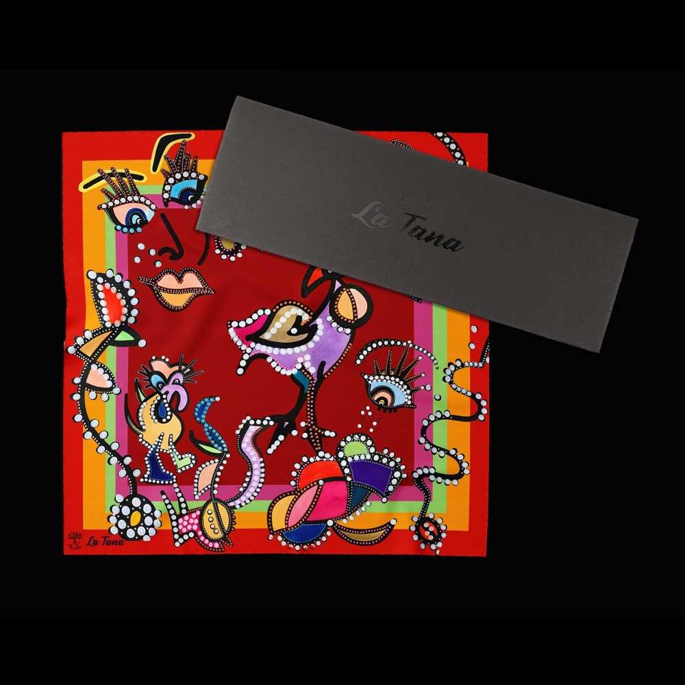 Tie Solution überträgt die dynamischen Bilder von La Tana mittels hochwertigem Digital- und Siebdruck auf ihre qualitativ hochwertigen Textilien. "Wir fühlen uns geehrt, mit einer Künstlerin von La Tanas Rang und Talent zusammenarbeiten zu dürfen", sagte ein Sprecher von Tie Solution.