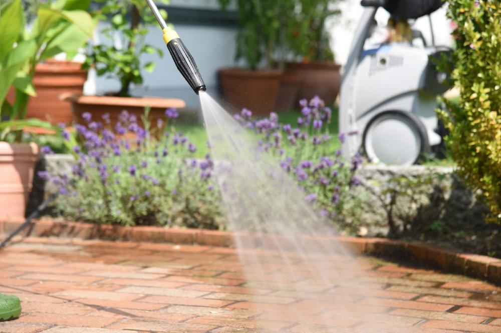 Um die zu reinigende Oberfläche zu schonen, ist die Wahl der richtigen Düse entscheidend. „Am besten eine verschmutzte Stelle erst mit etwas Abstand am Rand bearbeiten, um die Stärke des Hochdruckstrahls vorsichtig zu testen“, rät Julian Kroeber. So ist beispielsweise bei Pflastersteinen aus weichem Stein wie Kalkstein oder Marmor Vorsicht geboten, denn sie können durch den harten Wasserstrahl porös werden oder sogar brechen. Hartes Gesteinsmaterial wie Beton, Granit, Basalt oder Quarz sollte gebrannt sein.