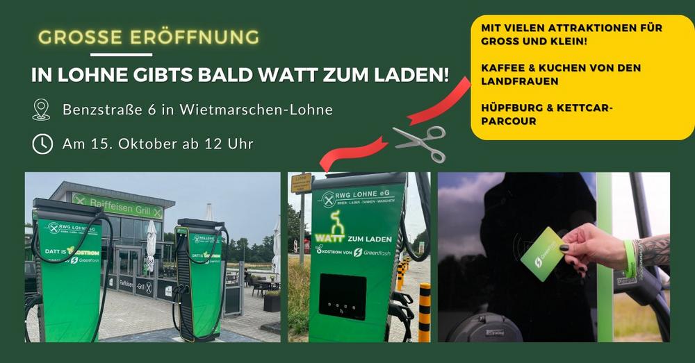 Die Eröffnung des Ladeparks beim Raiffeisen Grill und der Raiffeisen Tankstelle Lohne ist für den 15. Oktober geplant. Greenflash und die RWG Lohne lädt alle Interessierten ein, an diesem wichtigen Ereignis teilzunehmen und sich ein Bild von dem außergewöhnlichen Standort mit Tankstelle, Grill, Indoor Waschpark und Ladepark zu machen.