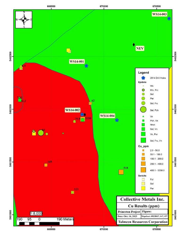 COLLECTIVE METALS INC. (CSE: COMT | OTC: CLLMF | FSE: TO1) (the “Company” or “Collective” – https://www.commodity-tv.com/ondemand/companies/profil/collective-metals-inc/) discusses integrated results from its initial program completed as part of its Due Diligence evaluation of the Princeton Project (the “Property”). The field program in early June included property-wide ground-truthing of recorded mineralization and alteration with particular focus on the Trojan-Condor Corridor, a >2-km-long northeast-trending geophysical and geochemical target approximately 10 km southwest of HudBay Minerals Inc.’s currently producing Copper Mountain Mine. Previous operators have identified several occurrences of copper mineralization along the corridor, associated with small intermediate to mafic intrusions. Collective geologists located, examined, and sampled exposures associated with the Trojan showing, the host diorite intrusion, and adjacent Nicola Group volcanic rocks. In contrast to previous exploration programs, rock samples were predominantly taken from outcrop or subcrop rather than locally derived float.