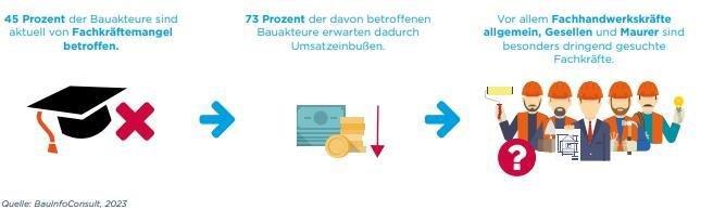 Unter Fachkräftemangel leidet die Baubranche nicht erst seit vorgestern. Doch mittlerweile ist es mindestens schon fünf nach zwölf: 45 Prozent der Betriebe am Bau sind selbst von Fachkräftemangel betroffen – und bei der Mehrheit von ihnen hat das direkte negative Folgen für die betriebliche Umsatzgenerierung. Doch ist die Baubranche dem Phänomen deshalb wehrlos ausgeliefert wie das Kaninchen der Schlange? Ergebnisse der Studie „Jahresanalyse“ von BauInfoConsult zeigen auch Perspektiven für die Bauwirtschaft auf, wie sie dem Fachkräftemangel Paroli bieten kann.