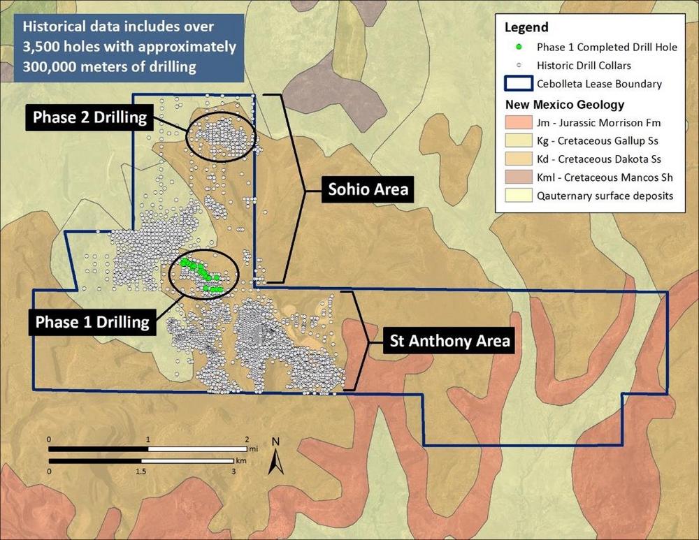 Cebolleta ist ein fortgeschrittenes Uranexplorationsprojekt mit einer historischen abgeleiteten Uranmineralressource von 5,6 Mio. Tonnen (5,1 Mio. Tonnen) mit einem Durchschnittsgehalt von 0,17 % eU O38 mit 18,98 Mio. Pfund (8.600 Tonnen) U O38 gemäß einem technischen Bericht gemäß NI 43-101 aus dem Jahr 2014, der vom früheren Eigentümer, Uranium Resources, Inc.[2] Die Zuverlässigkeit der historischen Schätzung wird als angemessen erachtet, jedoch hat eine qualifizierte Person keine ausreichenden Arbeiten durchgeführt, um die historische Schätzung als aktuelle Mineralressource zu klassifizieren und das Unternehmen behandelt die historische Schätzung nicht als aktuelle Mineralressource. Der Zweck des dreiphasigen Bohrprogramms besteht darin, diese Aufgabe zu erfüllen.