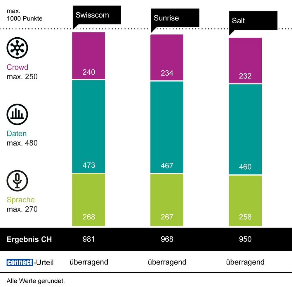 Bereits zum sechsten Mal in Folge erzielt die Swisscom den Gesamtsieg in der Schweiz. Der Anbieter erreicht 981 von 1.000 möglichen Punkten und damit die Note „überragend“. Swisscom ist führend in den Testdisziplinen Sprache, Daten und Crowdsourcing. Sunrise folgt mit 968 Punkten und erhält ebenfalls die Note „überragend“. In der Sprachdisziplin liegt der Anbieter nur einen Punkt hinter Swisscom; auch die Leistungen in den anderen Testdisziplinen sowie bei der 5G-Abdeckung sind überzeugend. Mit 950 Punkten erhält auch Salt zum ersten mal die Note „überragend“. Der Anbieter erzielt Top-Leistungen in der Daten-Kategorie, aber auch bei den Sprach-Bewertungen. Alle Anbieter haben sich im Vergleich zum letzten Jahr verbessert.
