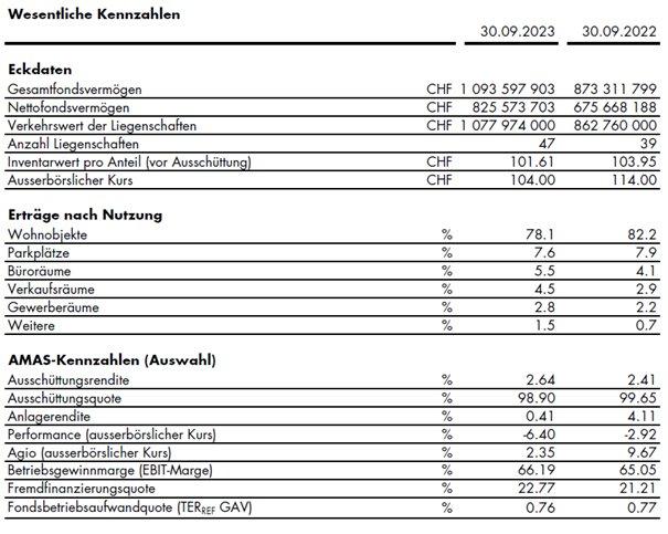 Der ausschüttbare Nettoertrag konnte im Vergleich zum Vorjahr markant von CHF 17.94 Mio. auf CHF 22.59 Mio. gesteigert werden, was einem Nettoertrag pro Anteil von CHF 2.78 entspricht (2022: CHF 2.76). Für das Berichtsjahr konnte die letztjährige Ausschüttung in Höhe von CHF 2.75 pro Anteil trotz höherem Finanzierungsaufwand konstant gehalten werden. Somit werden insgesamt 94.53 Prozent des zur Verteilung verfügbaren Erfolgs an die Anlegerinnen und Anleger ausgeschüttet, was einer Ausschüttungsquote von 98.90 Prozent entspricht. Auf Basis des OTC-Kurses von CHF 104.00 per 30. September 2023 ergibt sich eine erfreuliche Ausschüttungsrendite von 2.64 Prozent.