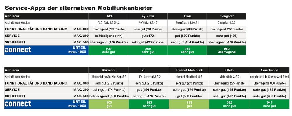 Welcher alternative Mobilfunkanbieter bietet seinen Kunden den besten und sichersten Service per App? Dieser Frage ist die Medienmarke connect erneut nachgegangen. Es wurden die Apps der neun Mobilfunk-Discounter Aldi, Ay Yildiz, Blau, Congstar, Klarmobil, Lidl, Freenet Mobilfunk, Otelo und Smartmobil mittels objektiver Verfahren getestet und verglichen. Betrachtet wurden die Kategorien Vertragsfunktionen, Funktionen zu Tarifen, Kosten und Rechnung sowie Service – im Schwerpunkt die Sicherheit der Nutzerdaten.