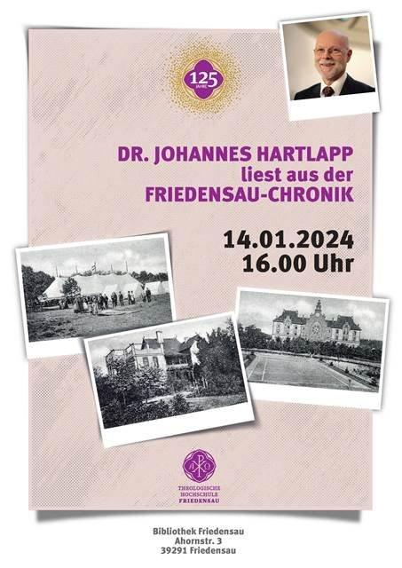 Auf die nächste Veranstaltung sei bereits heute als Vorschau hingewiesen: Am Sonntag, 11. Februar 2024, 16 Uhr, öffnet die Hochschulbibliothek für die Besucher der Ausstellung »125 Jahre Friedensau« ihre Türen. Gezeigt werden dann auf großen Stellwänden, in Dekaden untergliedert, das Wachstum und die Veränderungen des Ortes Friedensau von der Gründung bis in die heutige Zeit.
