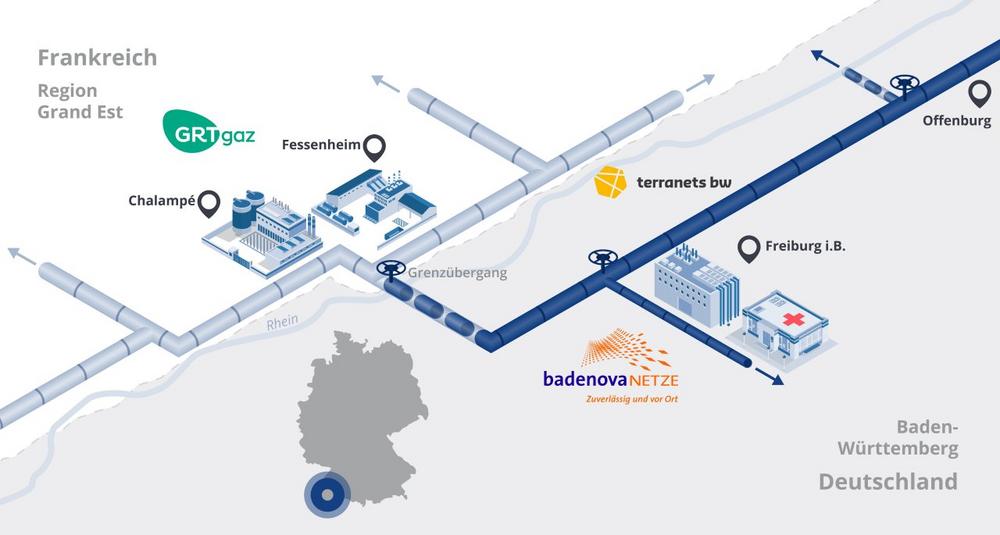 Vom 18. September bis 17. November 2023 führten die Netzbetreiber GRTgaz, terranets bw und die badenova Infrastrukturtochter badenovaNETZE eine Abfrage zu Wasserstoff-Bedarfen und Erzeugungspotenzialen in den Regionen Südlicher Oberrhein (Deutschland) und Grand Est (Frankreich) durch. Die Interessensabfrage der Projektpartner richtete sich gezielt an Unternehmen, die planen, Wasserstoff in großen Mengen zu produzieren oder zu beziehen. Konkret waren auf deutscher Seite die Land- und Stadtkreise Freiburg, Breisgau-Hochschwarzwald, Emmendingen und Ortenau angesprochen und auf französischer Seite das Gebiet Grand Est.