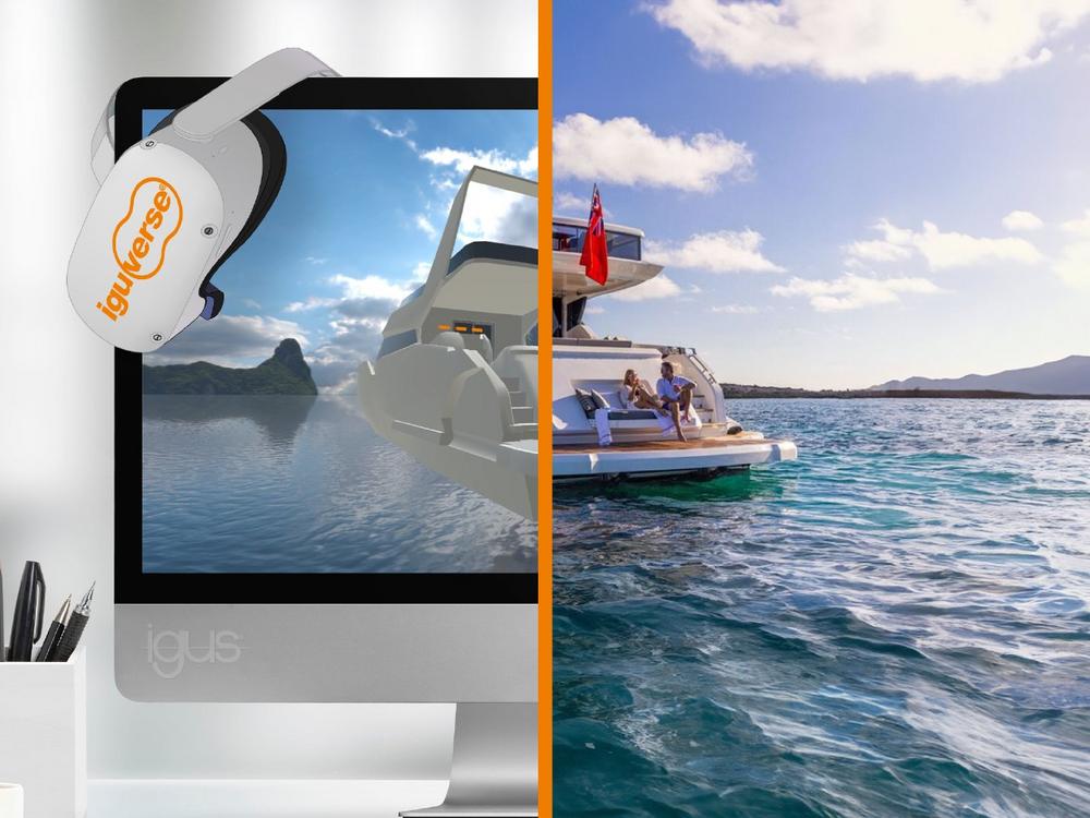 In einer schönen Bucht vor Anker liegen, zum Schnorcheln fahren oder ein paar Runden auf dem Jetski drehen: So stellen sich viele Boots- und Yachtbesitzer einen erfolgreichen Urlaub vor. Um Beiboote oder Jetskis sicher ins Wasser zu lassen beziehungsweise zu lagern, braucht es eine verlässliche Liftanlage oder Heckgarage. Genau das bietet H+B technics mit seinen individuell anpassbaren Systemen für die Boot- und Yachtindustrie. „Um Kunden und interessierten Messebesuchern die Produkte noch einfacher und flexibler präsentieren zu können, hat das Unternehmen jetzt einige Modelle in unserem iguverse nachbauen lassen“, erklärt Marco Thull, Senior Marketing Activist bei igus. „Als digitale Kollaborationsplattform in der Virtuellen Realität (VR) bietet es ganz neue Möglichkeiten der Produktpräsentation und -entwicklung.“ Mithilfe einer VR-Brille steigt der Interessent als Avatar in einen modernen, maritimen Showroom ein. Mittendrin finden sich eine Art digitale Zwillinge von Schiffmodellen mit den Produkten von H+B technics. So zum Beispiel eine Pearl 72 mit hydraulisch absenkbarer Badeplattform und Heckgarage sowie in der Garagenklappe integriertem Sitz. Nähert man sich als Avatar dem Schiff, lässt sich die Heckgarage ganz einfach per Klick auf- und zuklappen. Auch die Funktion des Seitenbalkons an einer Windy SR60 lässt sich so demonstrieren. Ein Klick und das Deck klappt sich an den Seiten runter und vergrößert so die Bewegungsfläche auf dem Schiff. Ebenso können Nutzer das Linearlift-System für Katamarane bestaunen. Hier setzt H+B technics auch auf die motion plastics von igus. In den hydraulischen Zylindern der Linearlifte sind die kompakten Energieketten E4.28 und E4.21 der bewährten Serie E4 verbaut. Sie eignen sich bestens für den Einbau in beengter Umgebung und bieten gleichzeitig eine hohe Stabilität. Dank der verwendeten Hochleistungskunststoffe sind die e-ketten nicht nur schmierfrei und besonders langlebig, sondern auch korrosions- und damit seewasserbeständig.